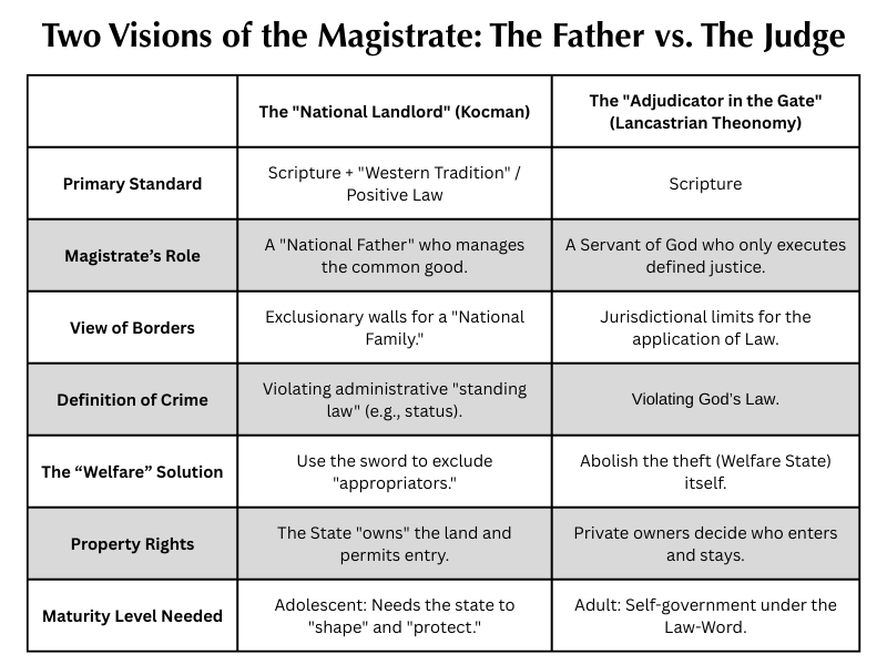 Alex Kocman’s attempt to find a “standard” for ICE ends up being a standard of pragmatic management, not judicial justice. He wants to use the magistrate’s sword to manage the unintended consequences of a socialist system. He asks, “By what standard?” and then proceeds to answer using the Western Legal Tradition rather than God’s Law. He admits that the state “does not determine the standards of justice but administers justice under God.” Yet, he then allows the state to invent a whole category of “crime” (immigration status) that appears nowhere in the Bible.